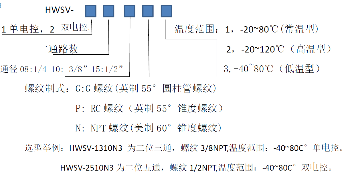 選型舉例:HWVP-1508N1-AC220V 不銹鋼二位五通電磁閥,單電控,連接內(nèi)螺紋,NPT1/4" ,常溫,電壓AC220V.